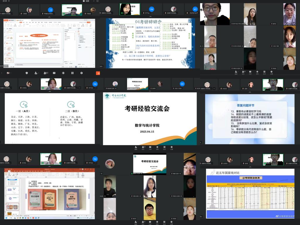 为帮助考研学子明确考研目标、鼓舞考研斗志,掌握学习方法与技巧,做好考研复习规划,4月15日晚,数学与统计学院举办线上考研经验交流会,邀请2018级、2019级4名毕业生分享考研成功经验和心得体会。会议由数学与应用数学系主任吴红艳主持,百余名学生参加了交流会。