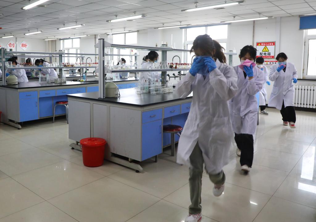 演练中,实验教师讲解了危险化学品泄漏后的规范化应急处置流程,强调了危险化学品泄露时学生自我保护的措施与应急疏散时的注意事项,指导开展模拟浓硫酸泄漏的应急处置,并组织学生按楼层、分前后、有秩序疏散。