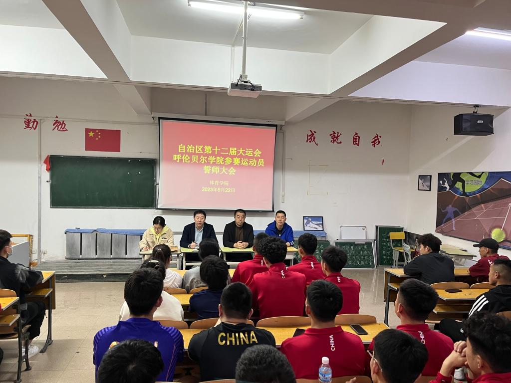 5月22日下午,自治区第十二届大学生运动会bat365中文官方网站参赛运动员誓师大会在体育学院山下体育馆二楼多媒体教室举行。学院党总支书记胡日查、院长李晓峰、相关科室负责人、各运动队教练员及运动员70余人参会。