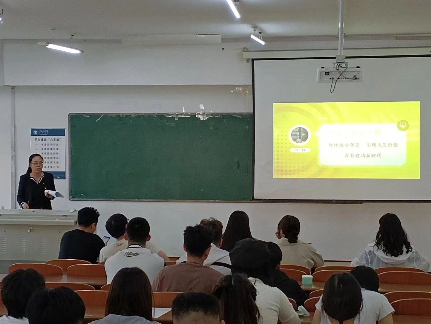 郭晶书记以《优化就业观念 实现人生价值 青春建功新时代》为题,围绕高校毕业生就业的重要性,就业形势,学校、学院做了哪些工作,毕业生应该怎么做四个方面展开讲解,并要求同学们要认清就业形势,理性就业;转变就业观念,积极就业;抓住就业机遇,及早就业;强化就业意识,高质量就业。郭晶书记鼓励同学们,青春因磨砺而出彩,人生因奋斗而升华,希望大家早就业、好就业、就好业,感恩父母,实现价值,回报社会。