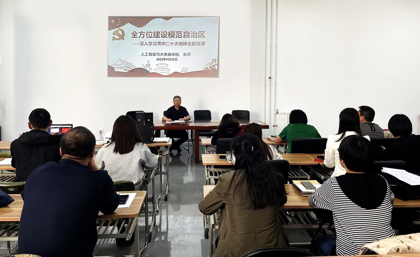 为全面贯彻党的二十大精神,深入落实习近平总书记对内蒙古的重要指示精神,9月20日,人工智能与大数据学院副书记赵君以《深入学习党的二十大精神,全方位建设模范自治区》为题为党员教师们讲授专题党课。全体党员参加了本次学习。