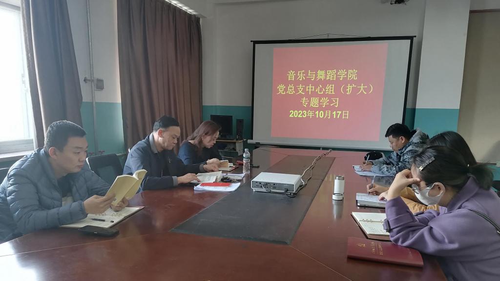 10月17日,在艺术楼606会议室,音乐与舞蹈学院党总支召开了中心组(扩大)专题学习会。学习会由学院党总支书记包德主持,班子成员、副科级以上干部参加。