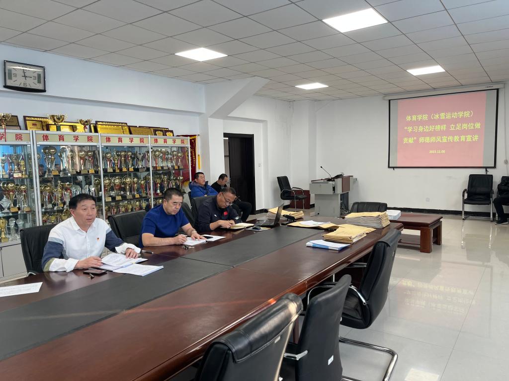 为进一步落实bat365官网“学习身边好榜样,立足岗位作贡献”系列活动,挖掘并宣传身边优秀教师典型,充分展示教师良好的职业形象和崇高的师德风貌,宣传优秀教师的榜样力量,11月8日,体育学院(冰雪运动学院)在东山体育场二楼会议室组织全体教师开展了师德师风分享会,由学院教师秦智勇、乌香玉和王瑞分别进行汇报。会议由学院党总支书记胡日查主持。学院院长李晓峰、副院长林剑冬以及全体教师共同参加会议。