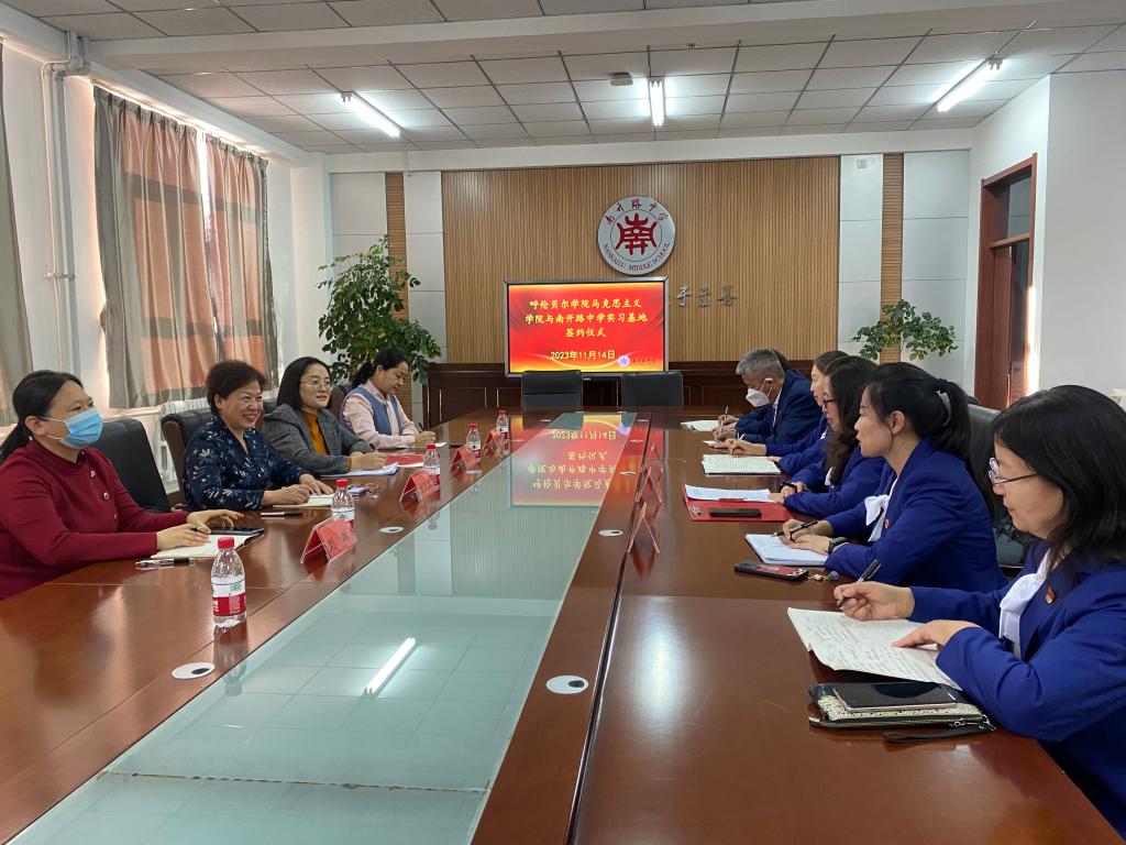 11月14日上午,马克思主义学院与海拉尔南开路中学签订了共建教育教学实践基地协议书。学院党总支书记刘凤琴,院长吴秀芳,副书记刘琳、副院长明兰和南开路中学校级领导班子及思政课教师代表参加了此次仪式。