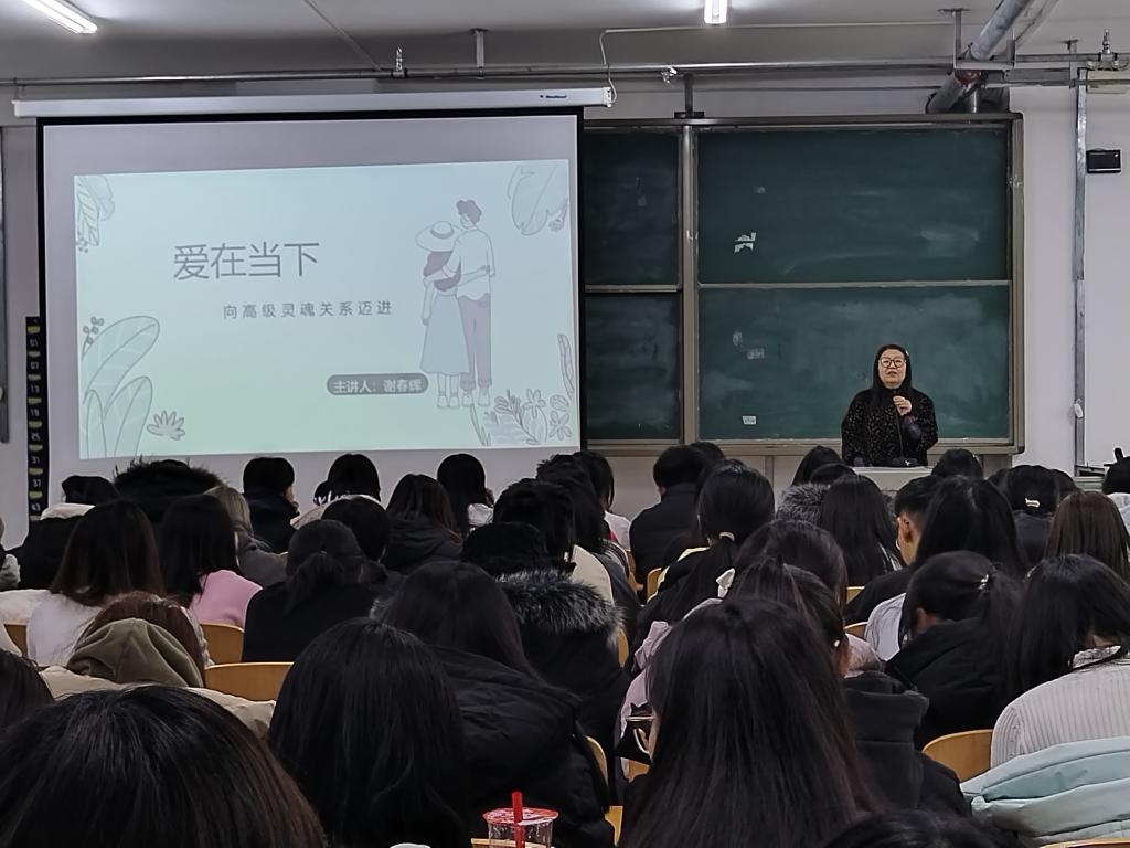 首先,谢春辉围绕以下三个方面进行讲解:良好的亲密关系是探寻生命真相的过程、经营亲密关系是唤醒智慧的过程、建立高级灵魂关系是找到自我的过程。她强调,在大学期间务必做到两件事——安身立命和培养亲密关系。接着,她向学生们讲述了在维持亲密关系中要秉持吸引原则、筛选原则以及高配感原则这三大原则。随后,她向学生们讲授如何在真挚永恒的亲密关系中寻找自我,并教会学生们如何感受爱、学会爱。