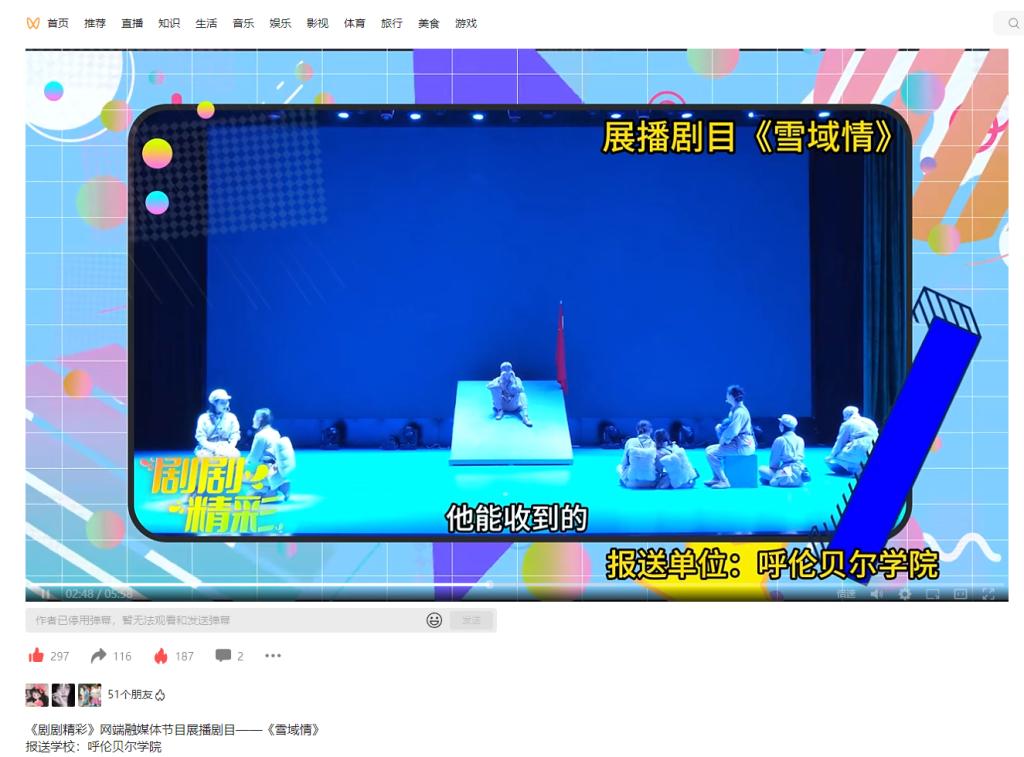 近日,文学院话剧团选送课本剧《雪域情》参加全区优秀课本剧评比,在300多部作品中脱颖而出,以前50名的优异成绩成功在内蒙古电视台奔腾融媒上进行精彩展播。全剧由文学院学生参与出演,历时两个多月,以最精湛的舞台演绎和最动人的精神内核,通过描写一段五十多年前的进藏历史,展现雪域高原瑰丽奇异的自然风光,发生在遥远的进藏女兵身上纯真而动人的爱情圣歌,构成了色彩斑斓的画面和震撼人心的故事。