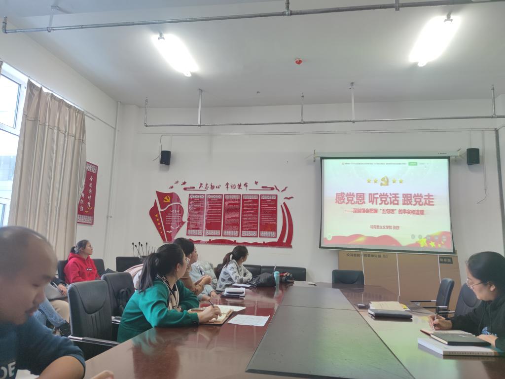 为全面学习宣传贯彻党的二十大精神,全力推动“感党恩、听党话、跟党走”群众教育实践活动走深走实要求,12月13日下午,马克思主义学院教师党支部在崇文楼B123会议室开展“五句话”的事实和道理主题宣讲,学院中国近现代史纲要课程教研室主任张舒作专题报告,学院全体教师参加学习。