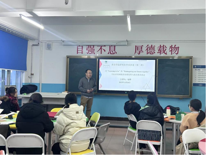 活动中,包锋为学生们介绍了一些OECD、UNESCO等组织,并为大家分享了联合国教科文组织发表的四份教育报告:《学会生存——教育世界的今天和明天》《教育——财富蕴藏其中》《反思教育:向“全球共同利益”的理念转变?》和《一起重新构想我们的未来:为教育打造新的社会契约》,同时紧扣教育报告内容为大家介绍了高质量期刊文章。他希望学生们广泛阅读各类书籍、文献,学会发现问题。