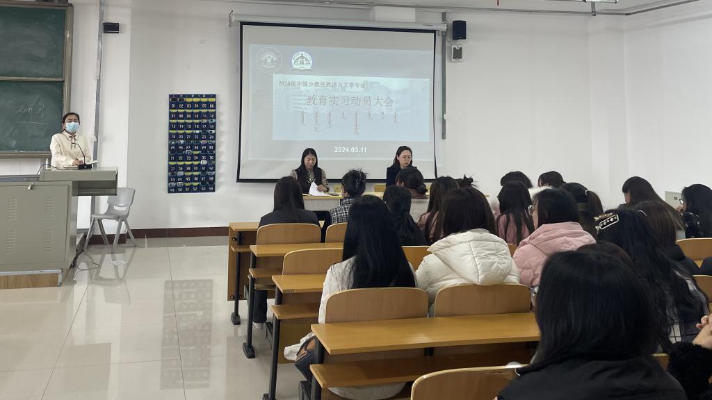 3月11日下午,蒙古学学院在崇文楼B401教室举行了毕业生实习动员大会暨就业工作推进会。学院党总支书记格根塔娜、副书记孔春艳、副院长小花、实验实训中心主任乌云斯琴及2024届毕业生参会。