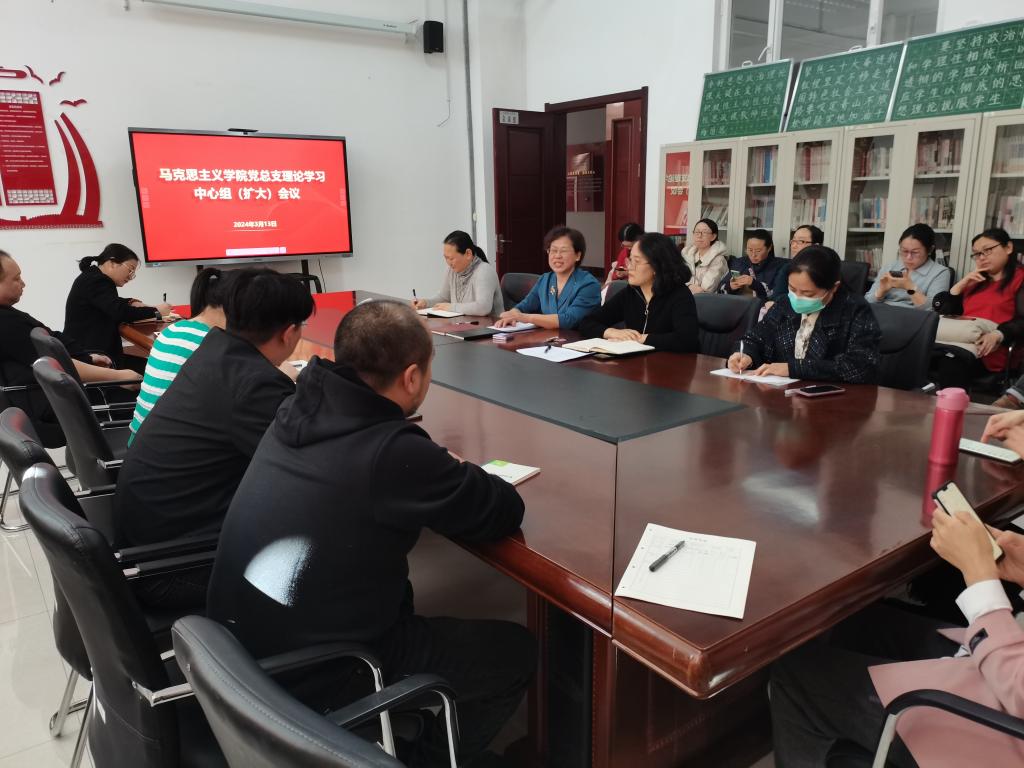 为深入学习贯彻全国两会精神,提高思政课教师政治素养和综合素质,3月13日下午,马克思主义学院党总支在崇文楼B123会议室召开理论学习中心组(扩大)学习会议,学院党总支书记刘凤琴主持会议,全体教师参加。
