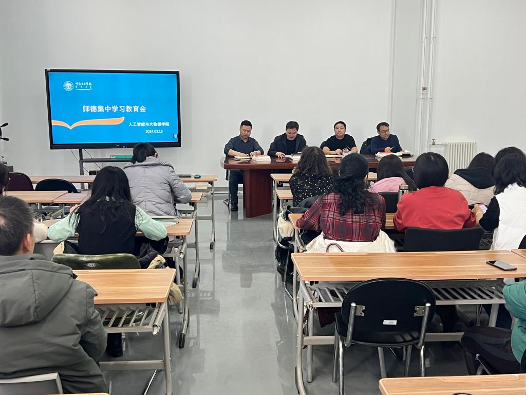 为坚决落实师德师风第一标准,落实新时代教师职业行为十项准则,加强新形势下师德师风建设,3月13日,人工智能与大数据学院在行知楼C118会议室开展师德集中学习教育活动。