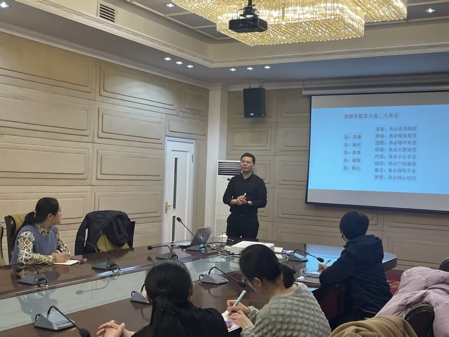 刘宝杰围绕国家社科基金申报常见问题、规范撰写申报书、申报技能技巧等三个方面展开,重点就如何规范撰写申报书,从国家社科基金选题、背景依据、学术史梳理、研究动态、研究对象、框架思路等方面进行了详细且深入的讲解和指导。他鼓励教师们结合自身研究专长,科学合理地规划科研目标,积极申报,精心选择题目,充分准备和反复打磨,努力提高各类社科项目的申报质量。