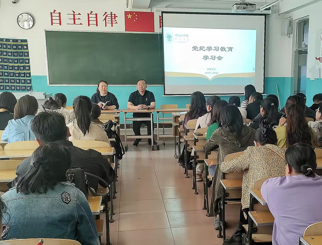 5月8日下午,教育学院在艺术楼405会议室开展党纪学习教育。会议由学院党总支书记海江主持,全体教师党员参加了会议。
