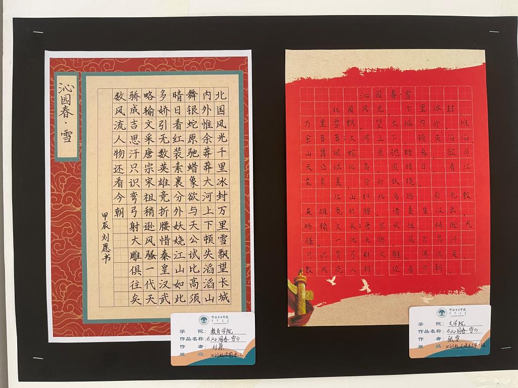 本次书法比赛不仅为热爱书法的同学搭建了一个互相交流的平台,还有助于提高师范生的职业技能和专业素质,帮助同学们去追寻红色印记、传承红色基因,使学生们从建功新时代、奋进新征程中汲取强大力量。