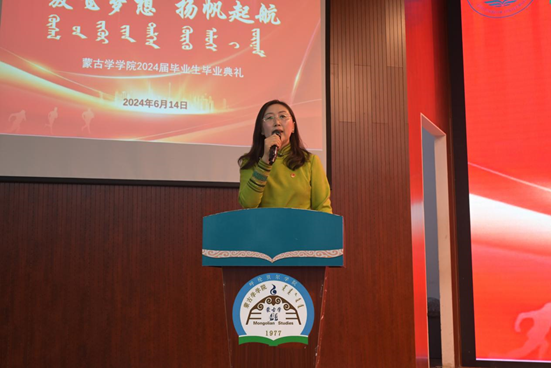 6月14日上午,蒙古学学院在崇文楼B小剧场召开2024届毕业典礼。学院领导班子成员、科级干部、团学办全体教师及2024届全体毕业生参加了毕业典礼。本次典礼由团学办教师乌日汉主持。