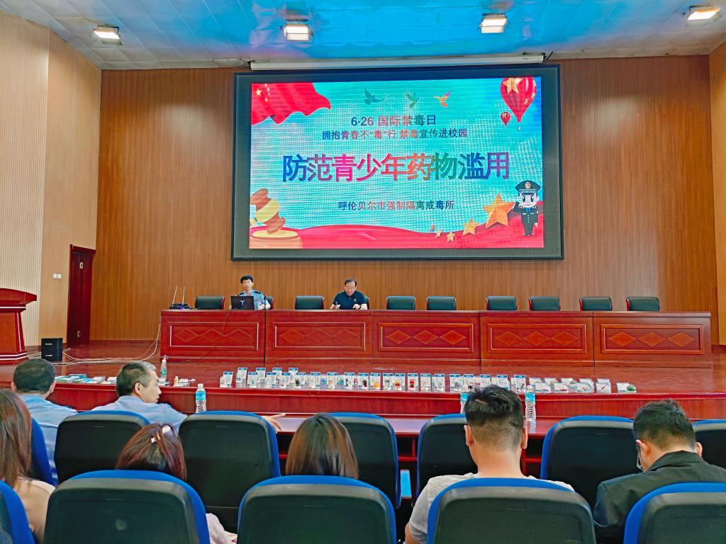 为了提高大学生的禁毒、防毒、拒毒意识,引导学生了解禁毒防毒知识,6月26日下午,教育学院联合呼伦贝尔市强制隔离戒毒所的警官们,为同学们带来一场关于“防范青少年药物滥用”的专题讲座。戒毒所副所长张占涛和四位警官,教育学院党总支书记、学工办主任及学生参加讲座。