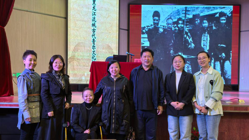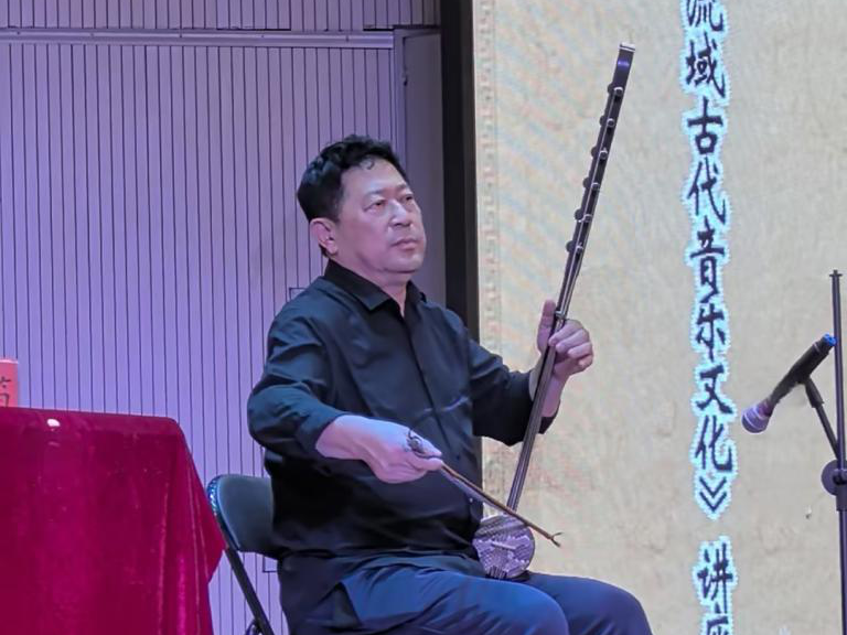苗笛围绕黑龙江流域古代音乐的历史渊源与发展脉络、不同民族在黑龙江流域创造的音乐特色、弓弦乐器在大兴安岭的起源等五个方面对黑龙江流域古代多元音乐文化的形成过程进行了深入解读。讲座中,他鼓励师生在采风过程中深入生活,扎根人民、描绘人民,将基层老百姓的心声与情感渗入到艺术创作中,以打造出时代精品。此外,他还结合自己多年的研究成果和实地考察经历,为听众展示并演奏六弦胡琴,不仅让听众更加直观地了解该乐器,也进一步激发了学生们对民族音乐领域的研究兴趣和热情。
