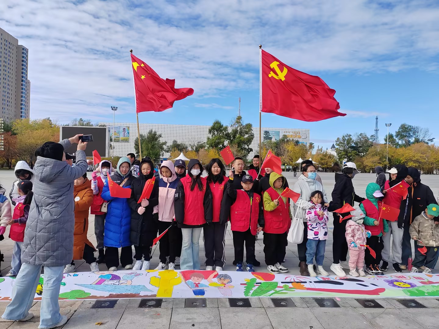 为庆祝中华人民共和国成立75周年,进一步弘扬爱国主义精神,传承红色基因,激发群众爱国情怀,10月1日上午,美术学院组织了一支充满热情的志愿者队伍,携手呼伦贝尔青年志愿者协会,在成吉思汗广场成功开展了以“亲子同心筑梦,共绘祖国美景”为主题的关爱儿童美育支教活动。