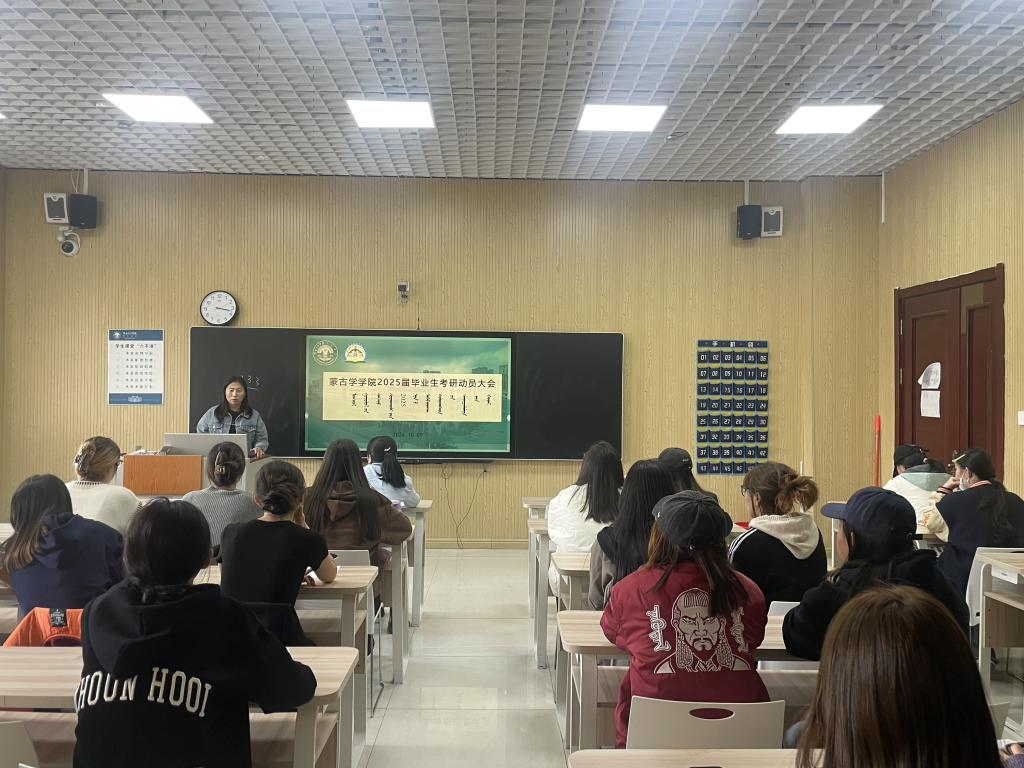 10月9日下午,蒙古学学院在崇文楼B228教室召开了2025届考研动员大会。此次大会旨在帮助大三学生全面了解考研的基本情况,提前锁定考研目标,明确备考计划,并有效解决备考过程中可能遇到的各种困难和问题。学院副院长小花、学业导师徐红云参会,共同为同学们加油鼓劲。大会由实验实训中心主任乌云斯琴主持。