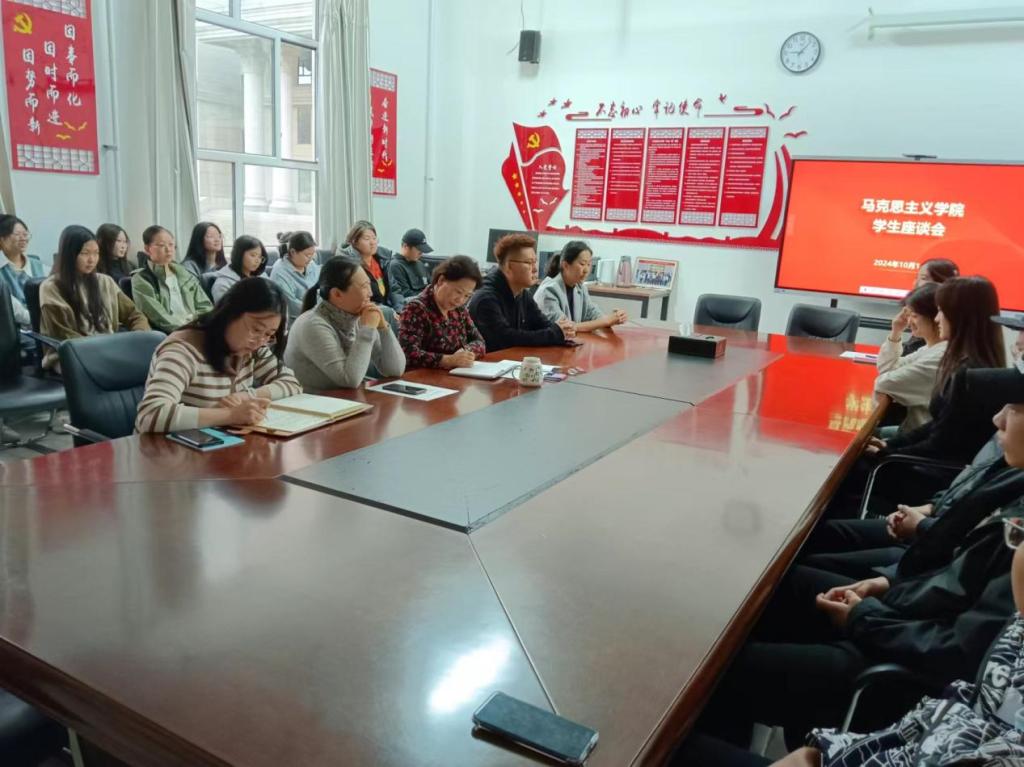 为进一步加强学生教育与管理,有效提升学生教育管理水平,及时准确了解学生的学习生活情况和思想动态,10月14日,马克思主义学院在崇文楼B123室召开2024级学生座谈会。学院党总支书记刘凤琴、副书记刘琳,思想政治教育系主任魏婉莹、团学办公室副主任查娜、辅导员齐宸以及2024级40余名新生参加了座谈会。