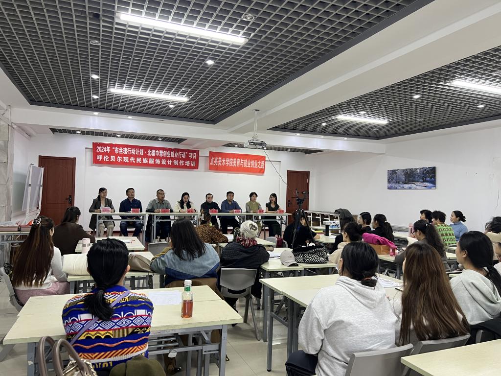 10月16日,2024年“布丝瑰行动计划·北疆巾慧创业就业行动”项目呼伦贝尔现代民族服饰设计制作培训在美术学院举办了开班仪式。呼伦贝尔市妇联四级调研员杨威、鑫衣北方原创服饰设计师姜心、bat365中文官方网站美术学院党总支书记巴达日呼、党委宣传部副部长白玫、教务处副处长王继刚、招生就业处副处长杜志闯、美术学院公共美育教研室主任桂丽以及30名培训学员参加了此次开班仪式,呼伦贝尔市妇联权益和发展联络部部长包迪娅主持。