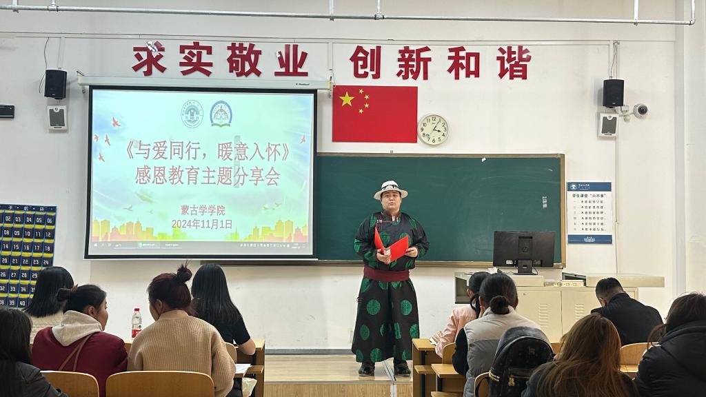 为了加强学生的感恩教育,培养学生的社会责任感和良好道德品质,树立良好的典范,11月2日下午,蒙古学学院在崇文楼B206教室举办“与爱同行,暖意入怀”感恩教育主题分享会。学院党总支书记格根塔娜、副书记孔春艳,团学办老师和全体受各类奖助学金学生参加了会议。学生坦黑拉主持分享会。