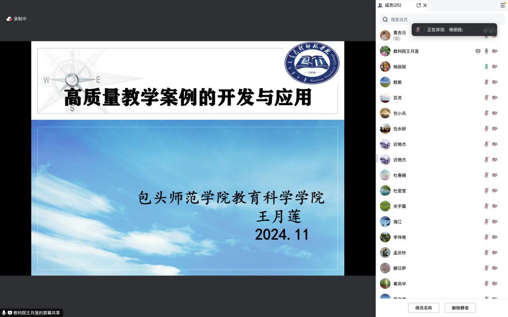 为了提升研究生教学的实效性和创新性,11月20日,教育学院在线上举办了一场主题为“高质量教学案例开发与应用”的专家讲座。本次讲座特邀内蒙古科技大学包头师范学院的王月莲教授,为老师们带来了一场深入浅出、内容丰富的学术盛宴。讲座由学院学前教育系主任杨丽丽主持,学院领导班子成员及学前教育专业、小学教育专业部分教师聆听了讲座。