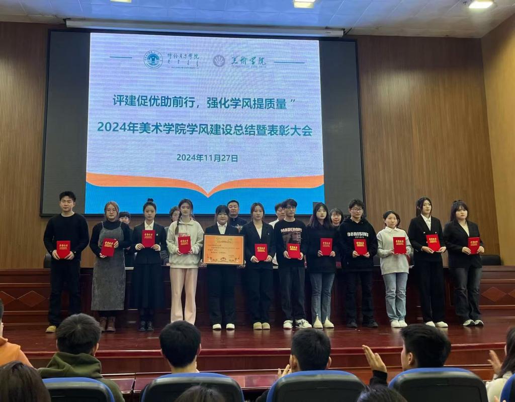 2024年,美术学院以习近平新时代中国特色社会主义思想为指导,以铸牢中华民族共同体意识为主线,全面贯彻落实党的教育方针,围绕立德树人根本任务,坚持“以评促建、以评促改、以评促管、以评促强”,突出内涵发展、特色发展与创新发展,挖掘出了众多优秀的成果与经验,美术学院于11月27日在图书馆四楼报告厅召开“评建促优助前行,强化学风提质量”学风建设总结暨表彰大会。美术学院领导班子成员、各系主任、团学办全体成员及各年级学生等四百余人参加了会议。