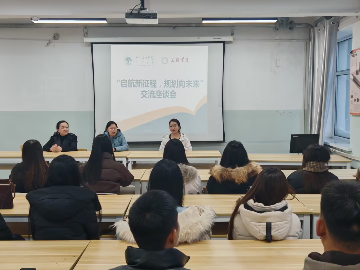 为深入了解学生学习、生活情况,更好地关爱学生、答疑解惑、解决问题,指导班级建设,培养优良的班风、学风,为班级发展及学生成长提供指导与支持,11月28日,bat365中文官方网站图书馆党总支书记彬彬来到联系班级2021级环境设计班,开展了“启航新征程,规划新未来”交流座谈会。美术学院党总支书记巴达日呼、副书记张巍巍,学院教师任晶及2021级环境设计班全体学生参会。