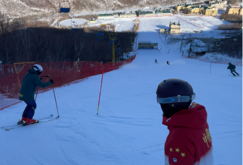 滑雪场的初级雪道上,同学们如一群欢快的小鸟,在老师的指导下,小心翼翼地尝试着向下滑行。他们努力保持着平衡。每滑出一段距离,他们的脸上便会绽放出灿烂的笑容,那是收获进步与成长的喜悦。