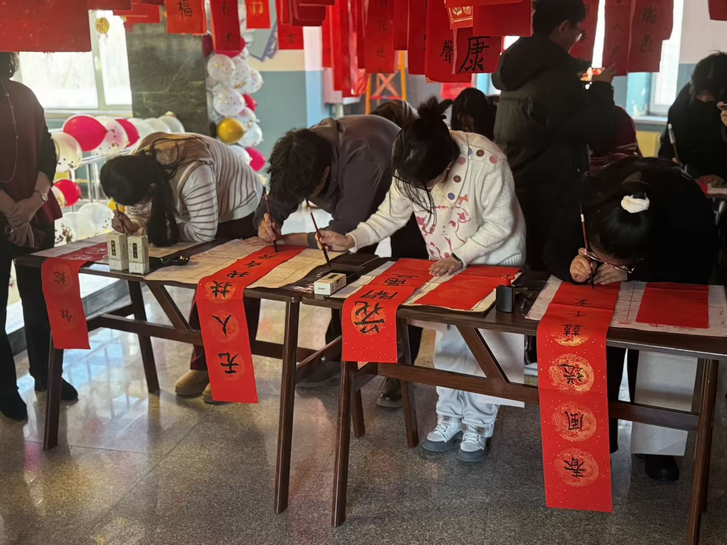 活动现场,学生精心展示的一副副对联墨香四溢,吸引师生们驻足欣赏。这些对联对仗工整、用词精妙,不仅蕴含着对新年的美好祈愿与祝福,也充分展现了中华传统文化的独特魅力。在欢快的背景音乐烘托下,同学们还现场挥毫泼墨进行写对联表演,他们满怀热忱、以笔为媒,尽情挥洒对中国传统文化的热爱与敬意,一笔一划间,寓意美好的对联跃然纸上,精彩的表演赢得阵阵喝彩。无论是笔法的娴熟运用,还是对对联内涵的深刻理解与表达,都彰显出同学们扎实的传统文化功底与积极向上的精神风貌。