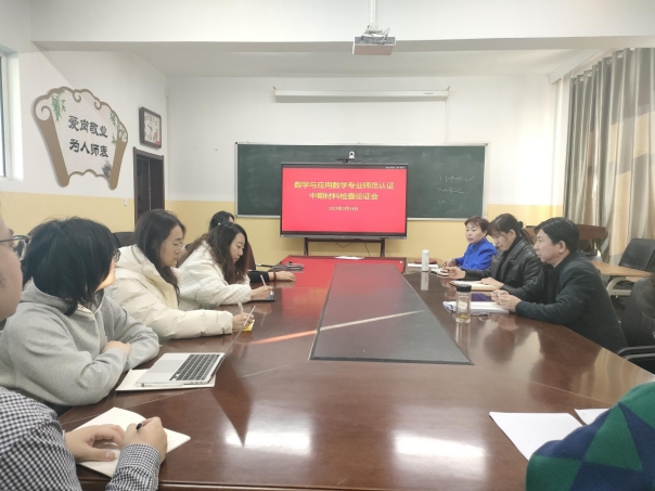 为迎接数学与应用数学专业师范类认证中期检查,按时完成材料提交,2月14日上午,数理学院基础数学系在笃学楼410会议室召开了数学与应用数学专业师范类认证中期材料检查论证会。会议由学院党总支书记杨巧智主持,副院长包来友、红兰,党总支副书记乌日拉,基础数学系主任项楠等教师参会。