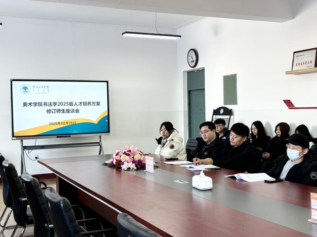 2月25日,美术学院在尚行楼会议室召开书法学2025版人才培养方案修订师生座谈会。书法系主任张明星,教师杨文宾、刘佳、张昊及书法系全体学生共同参加会议。此次座谈会旨在广泛听取师生意见,进一步优化人才培养方案,提升书法学专业人才培养质量。