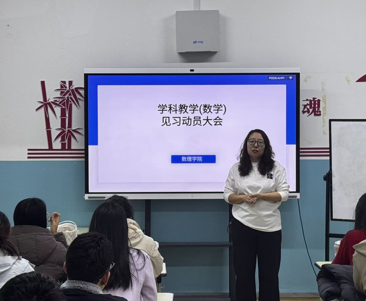 见习启动前夕,学院在笃学楼305教室召开专项动员大会。会上,学院研究生教学部主任白红梅强调:“研究生阶段的见习,不仅是学习教学技能,更要带着研究视角观察中学数学教学的现实问题,将科研思维融入教学实践。”她要求研究生们在见习过程中收集案例、提炼问题,形成有价值的研究思考。