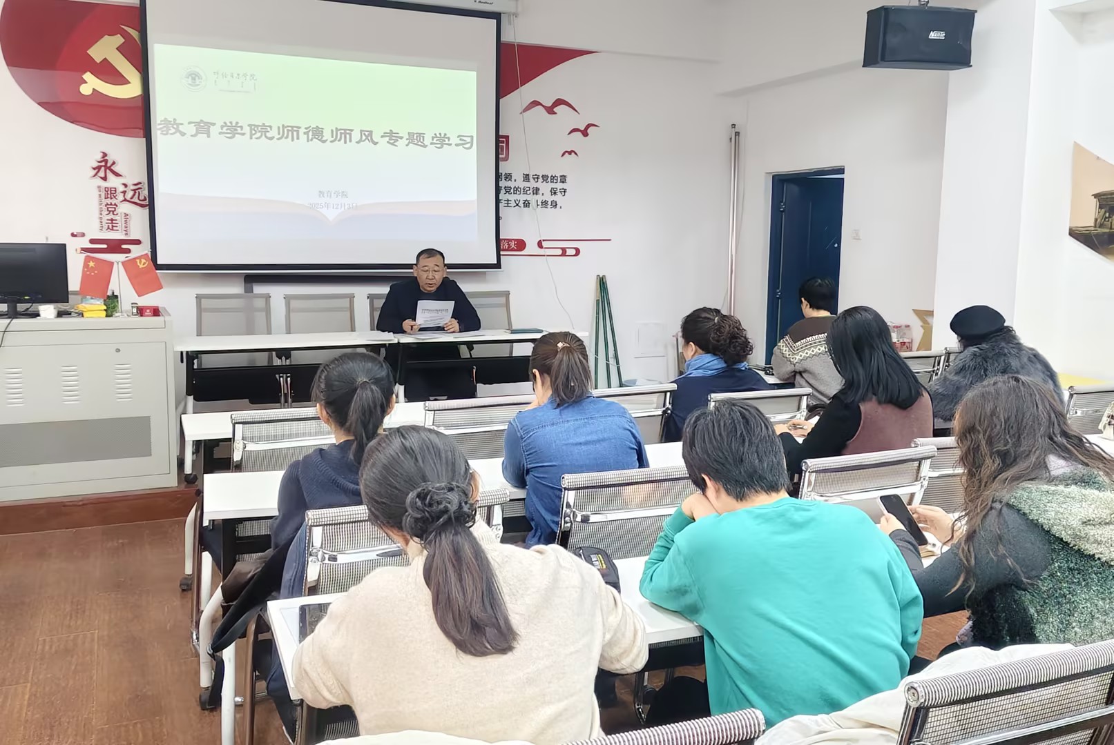 在警示教育环节,全体教职工集中观看了关于加强教育领域(师德师风)不当牟利突出问题警示教育的专题纪录片。纪录片以真实案例为镜鉴,深刻剖析了师德失范行为特别是利用职务之便不当牟利带来的严重危害与后果,为全体教师敲响了警钟。