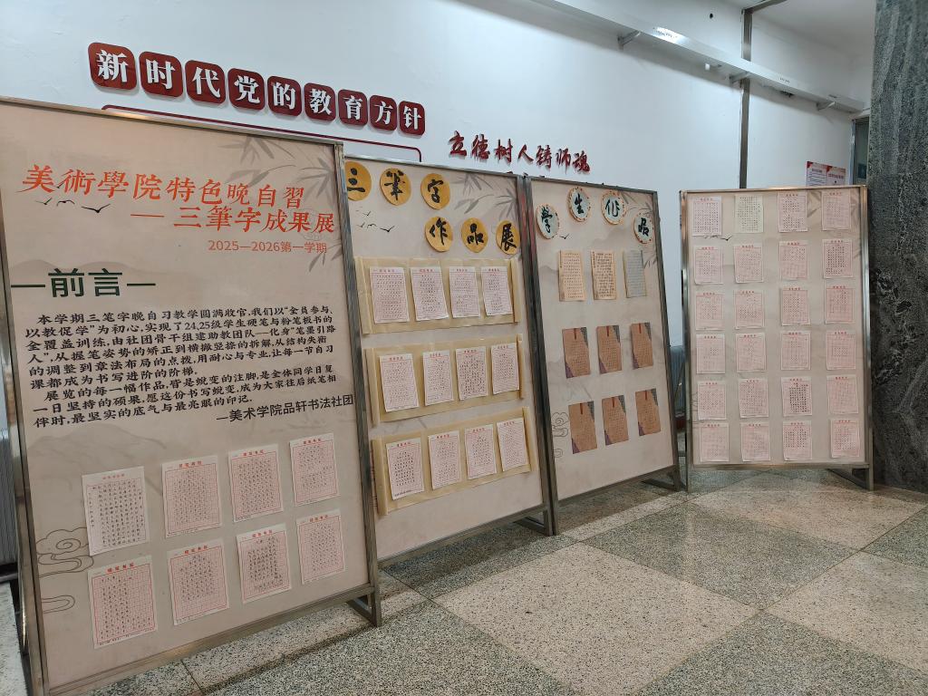 为深入落实师范生教学基本功培养,传承和弘扬中华优秀传统文化,美术学院以“特色晚自习”为载体,创新育人模式,于10月14日至12月10日,精心组织开展了主题为“笔韵攻坚,字艺精进”的“三笔字”技能提升训练活动,并于活动收官之际举办成果专题展览,全面展现学子们在书法技艺与文化修养上的成长蜕变。
