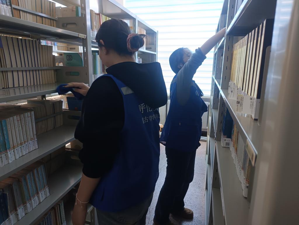 第二组志愿者们,在图书馆阅览室管理老师的指导下,认真细致地对图书馆藏书进行分类、整理、上架,方便读者查找借阅。将最新一期的期刊杂志整齐地摆放在阅览室,为读者提供最新的资讯信息。对阅览室、自习室、走廊等区域进行了全面清洁,为读者营造干净整洁的学习环境。