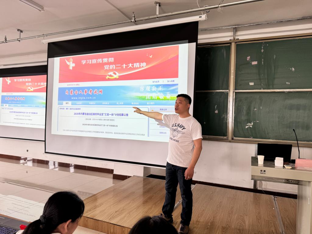 宣讲会上,阿那巴达围绕同学们最为关注的西部计划、“三支一扶”、社区民生三大基层就业项目,展开全面且细致的政策解读。针对西部计划,详细讲解了项目招募对象、服务地域、服务期限、生活补贴、社保保障、交通补助等核心内容,同时重点说明服务期满后在考研加分、公务员定向招录、事业单位专项招聘等方面的优惠政策,鼓励学子们奔赴西部,在祖国最需要的地方奉献青春力量。对于“三支一扶”计划,从支教、支农、支医和帮扶乡村振兴四个岗位方向入手,逐一梳理招募条件、报名流程、考核方式及后续发展保障,结合历年招录数据与实际案例,让同学们清晰掌握该项目的就业优势与发展前景。针对社区民生项目,重点解读了基层公共服务岗位的工作内容、薪资待遇、职业发展通道,以及社区民生工作在服务群众、助力基层治理中的重要意义,帮助同学们打破对基层工作的认知误区。宣讲过程中,老师用通俗易懂的语言,将晦涩的政策条文转化为实用的就业信息,针对同学们提出的报名资格、岗位选择、服务期权益、后续就业创业扶持等问题,逐一耐心解答,现场互动频繁,氛围热烈。