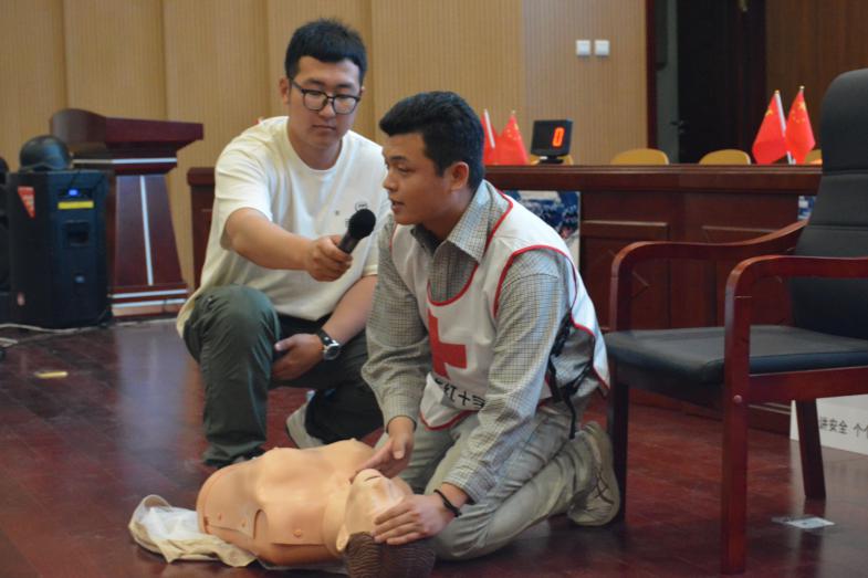 在中场休息期间,校园安全管理处的人员利用模拟人示范了如何实施心肺复苏,详细演示了海姆立克急救法的操作步骤,并现场指导心肺复苏和海姆立克急救法的操作技能和注意事项。