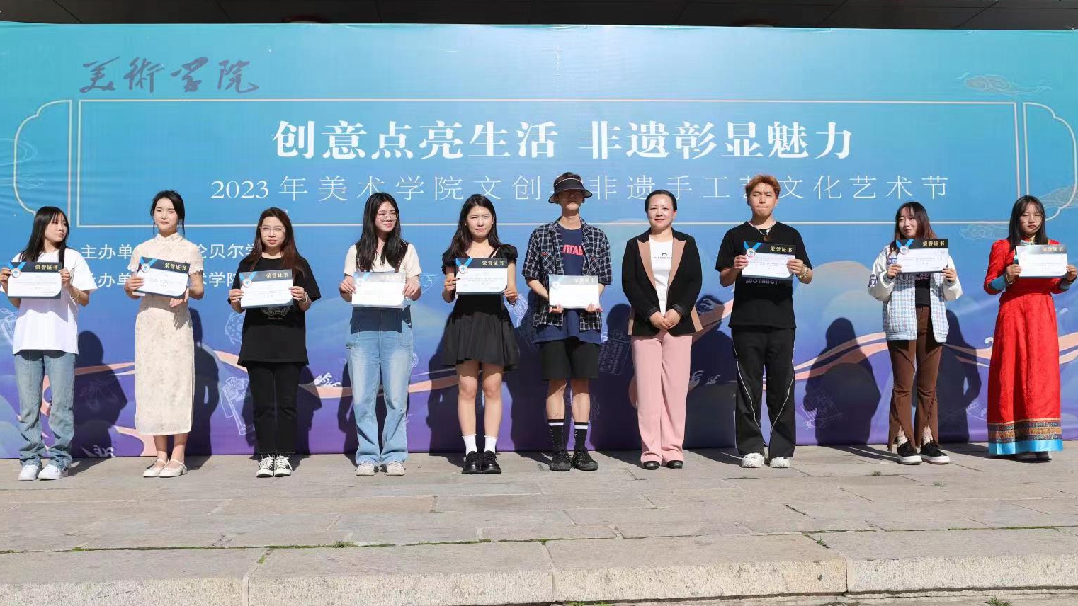 6月11日,由团委和美术学院共同主办的“创意点亮生活·非遗彰显魅力”文创与非遗手工艺文化艺术节在尚行楼门前开幕。呼伦贝尔市科学技术协会科普部副部长金妍、bat365中文官方网站宣传部副部长白玫、团委副书记湛楠、美术学院领导班子和全体教师出席开幕式。活动现场分三大展区,有非遗手工艺展示区、文创作品展示区、非遗体验区,共收到了来自bat365官网9个学院230余件富有特色的艺术作品。