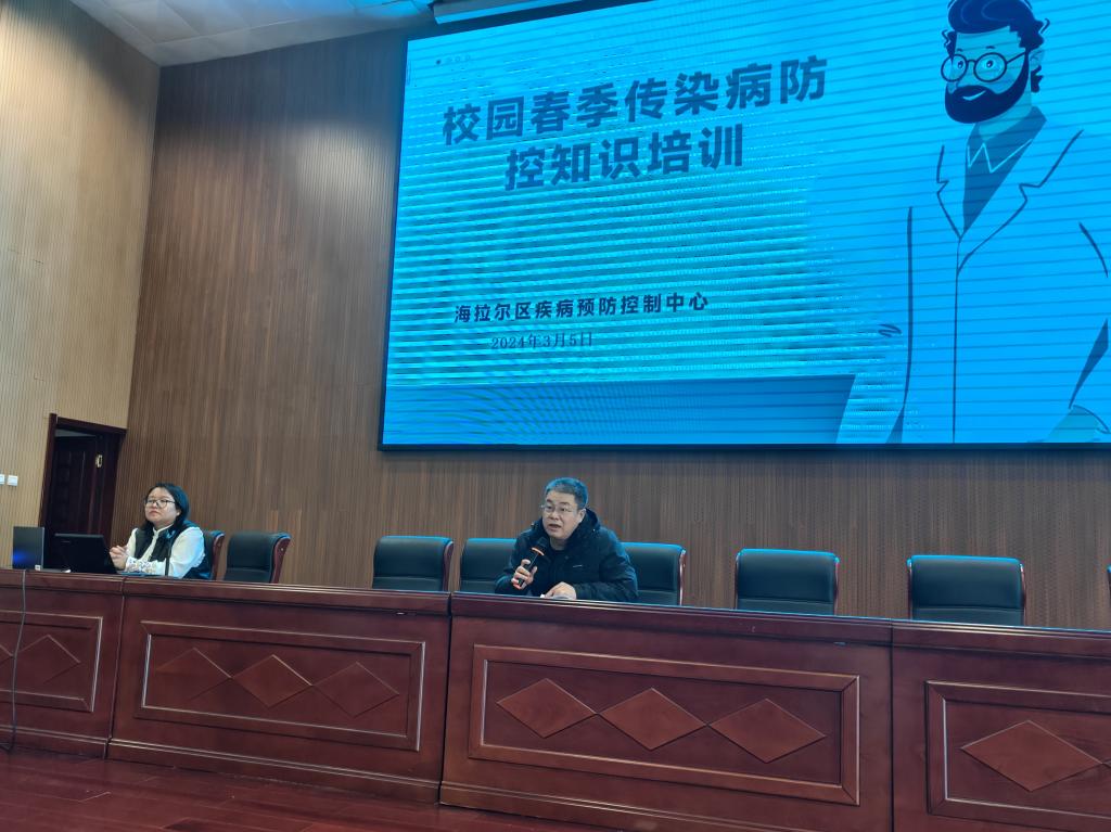 为有效预防春季开学传染病的传播,3月5日下午,后勤管理处邀请了海拉尔区疾病控制中心科长马妍,在图书馆四楼报告厅举办了春季校园传染病防控知识的专题培训。后勤管理处党总支书记倪俭主持会议,学生工作处相关人员、校医院全体医务人员、各学院团学办主任及学生骨干、饮食服务中心管理人员及食堂的工作人员、物业管理人员、保洁员、宿舍管理教师及校办服务中心相关企业代表等参加培训。