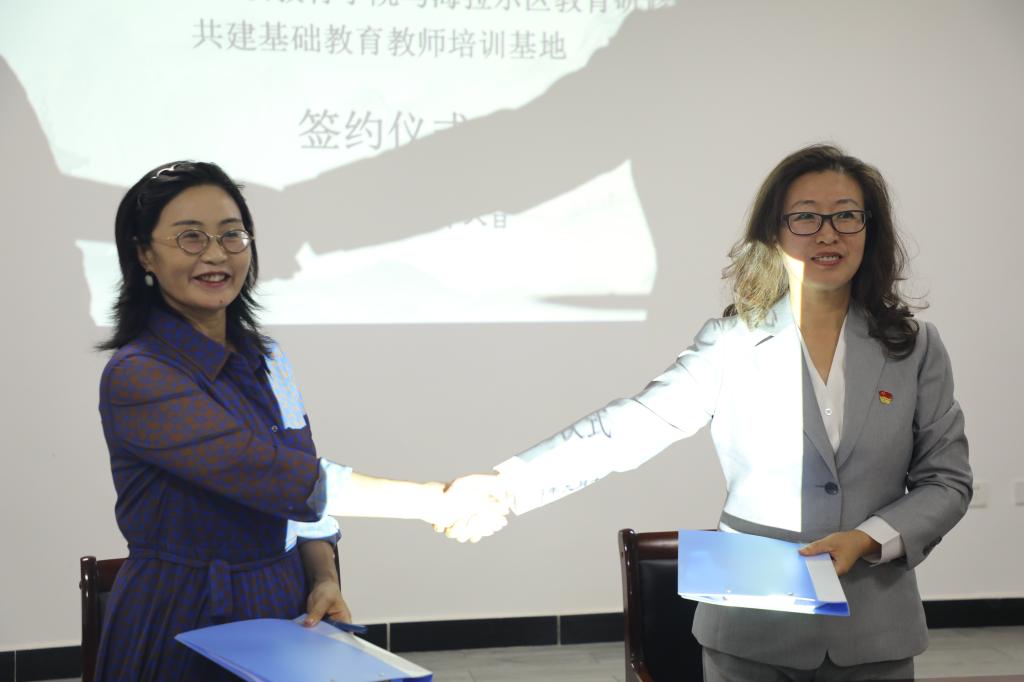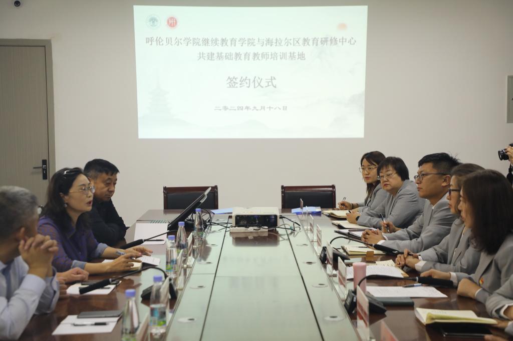 9月18日下午,bat365中文官方网站继续教育学院与海拉尔区教育研修中心共建基础教育教师培训基地合作协议签约仪式在海拉尔区教师研修中心二楼会议室举行。继续教育学院党总支书记李健、院长莎茹莉及班子成员,海拉尔区教育研修中心主任胡慧婷及班子成员、各科室负责人参加了签约仪式。