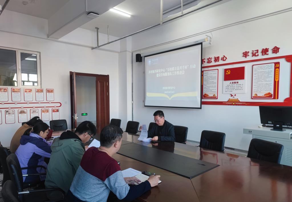 10月24日,乡村振兴研究中心在崇文楼A座420会议室组织召开“百校联百县兴千村”行动(以下简称“百百千”行动)建设咨询服务队工作推进会。会议由乡村振兴研究中心主任张玉桩主持。建筑工程学院副院长方明伟、乡村振兴研究中心综合办主任布赫、农学院教师胡达古拉、马克思主义学院教师刘闯等参加了会议。