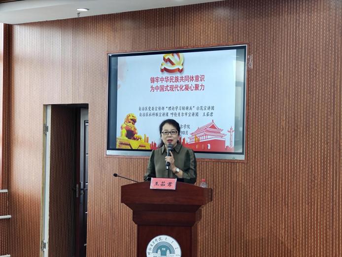 讲座上,呼伦贝尔市社科联副主席王茹君以《铸牢中华民族共同体意识 为中国式现代化凝心聚力》为题,从中华民族共同体意识的提出过程和主要含义、中华民族共同体意识提出的重大意义、铸牢中华民族共同体意识是做好新时代民族工作的主线、历次中央民族工作会议和铸牢中华民族共同体意识、为中国式现代化凝心聚力等五个方面进行了深刻阐述和解读。