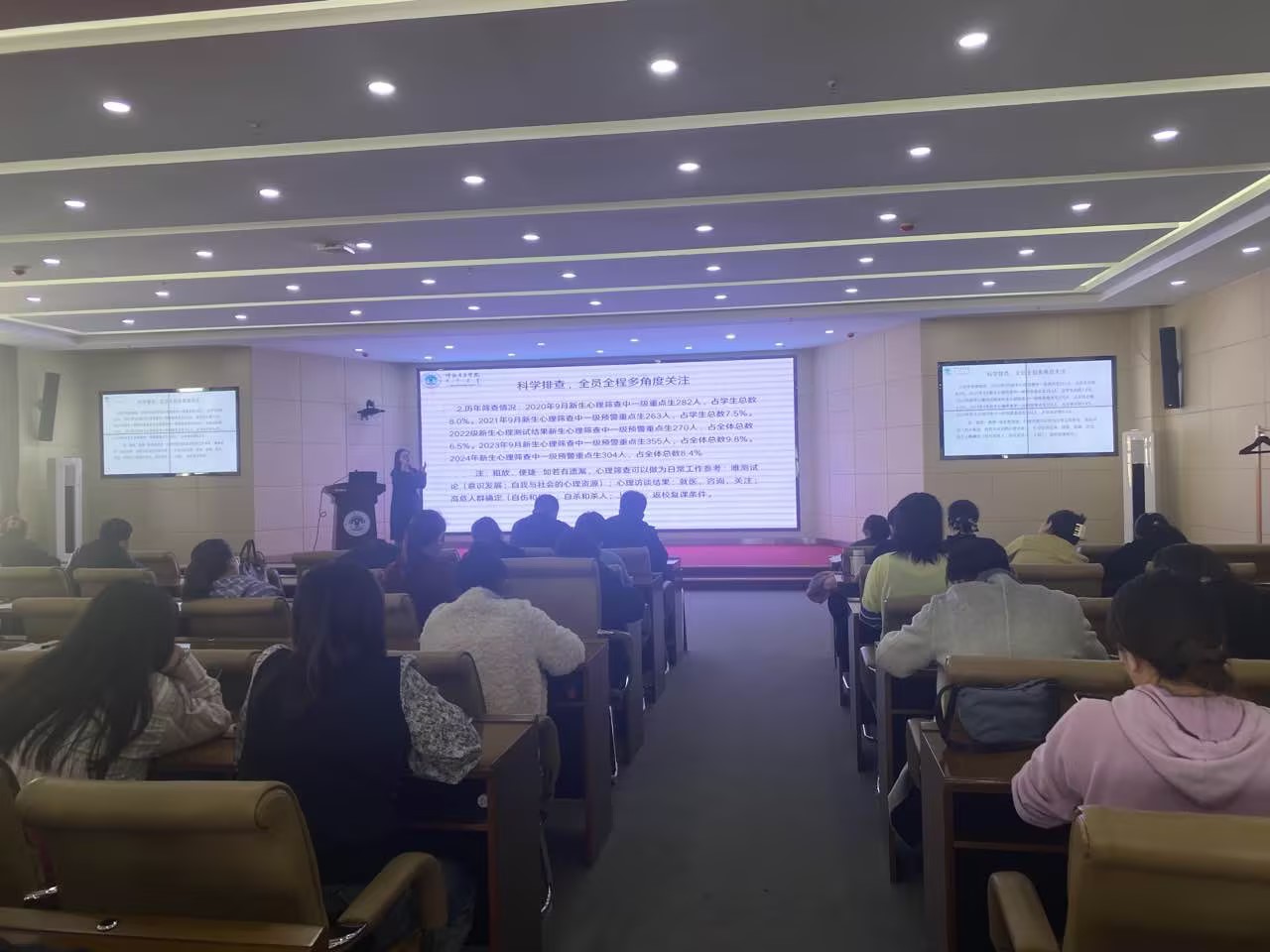 谢春辉系统讲述了大学生心理安全防控工作如何前置预防及科学干预,重点指出要坚决做到全员参与,全程多角度排查,落实落细预防机制,筑牢学生生命防线,为学生提供专业访谈并做好长期跟进。