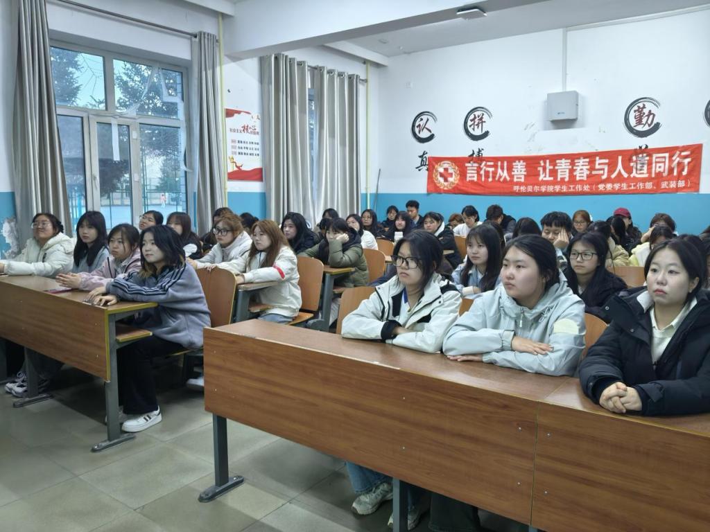 为深入学习贯彻习近平总书记关于红十字事业的重要指示批示精神,弘扬“人道、博爱、奉献”的红十字精神,在第78个“世界红十字日”来临之际,4月29日,学生工作处在笃学楼107室开展“矢志人道 携手同行”红十字博爱周活动,52名同学参与其中。呼伦贝尔博爱讲师团讲师、学生工作处资助与实践科科长张晓娜担任主讲,为同学们专题讲解“人道法”知识。