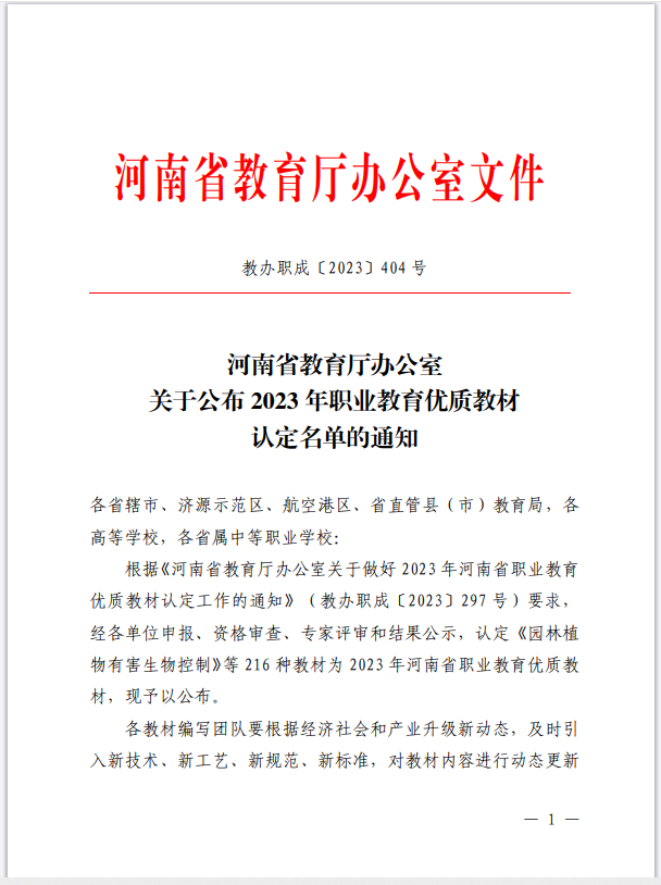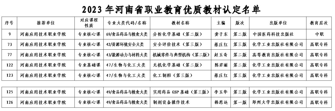 近日,河南省教育厅发布《河南省教育厅办公室关于公布2023年职业教育优质教材认定名单的通知》(教办职成〔2023〕404号)文件,必赢官网《分析化学基础(第二版)》等7部教材入选2023年河南省职业教育优质教材名单,其中中职类教材1部,高职高专类教材6部。