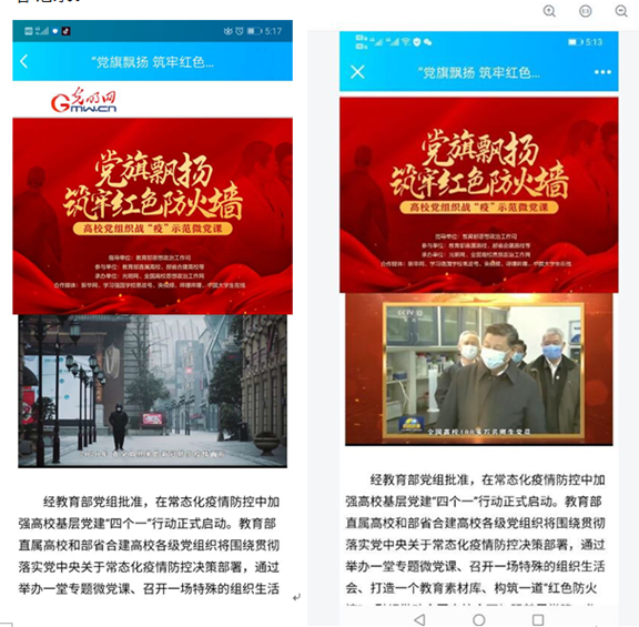 2020年6月19日,在接到学校党委组织部关于组织观看高校党组织战“疫”示范微党课的通知后,制药工程学院党总支立即通过微信群、QQ群进行了通知与观看布置。学院总支17名党员、33名教师先后通过电脑或手机端,观看了由北京大学、清华大学、武汉大学、华中科技大学的党委书记和基层党组织书记的宣讲微党课并截屏上传了收看记录。