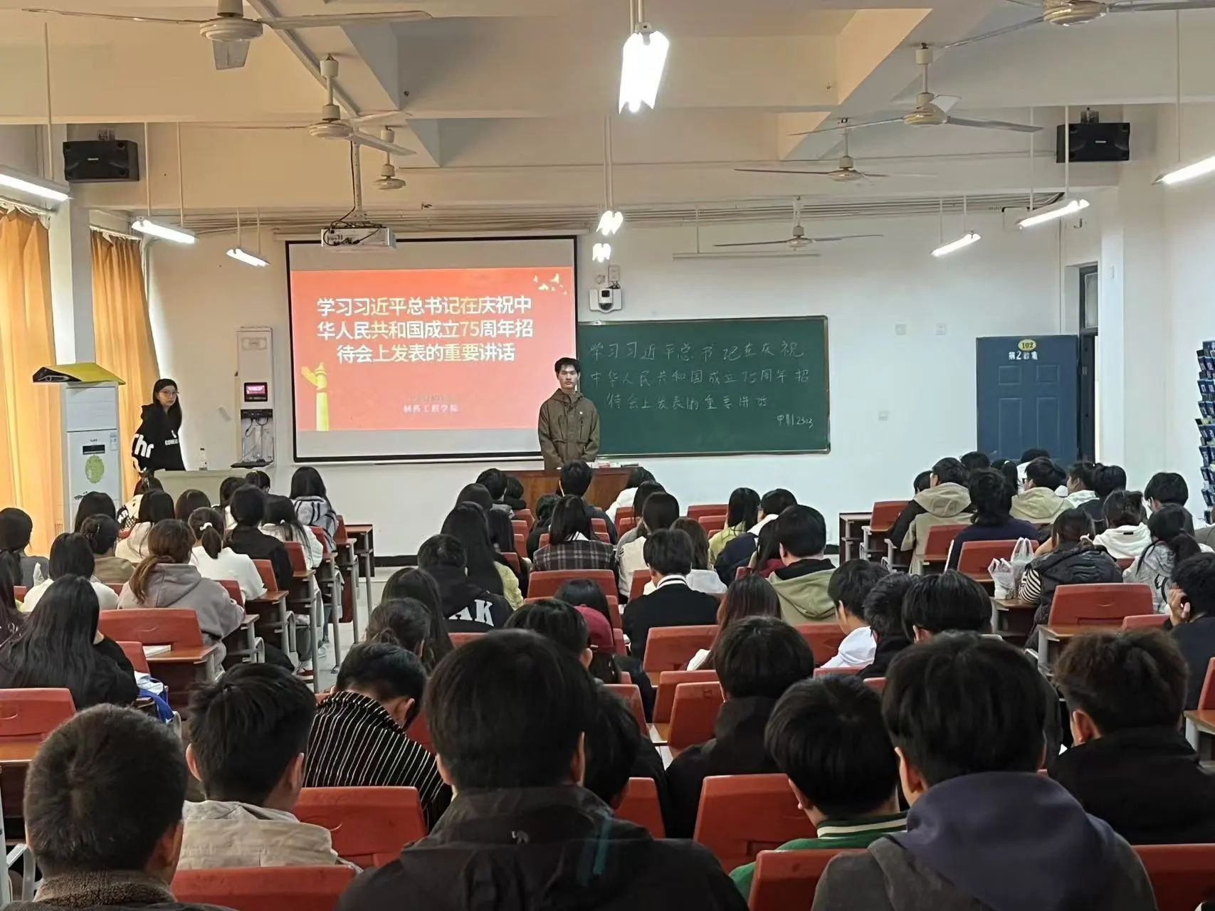 为深入学习贯彻习近平新时代中国特色社会主义思想,引导广大学生深入理解与把握习近平总书记关于中国式现代化的重要论述,凝聚青年奋进的力量,牢记历史使命和责任担当,制药工程学院于11月13日下午召开了“学习习近平总书记在庆祝中华人民共和国成立75周年招待会上发表的重要讲话”主题团课。