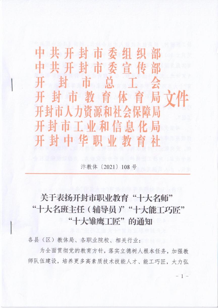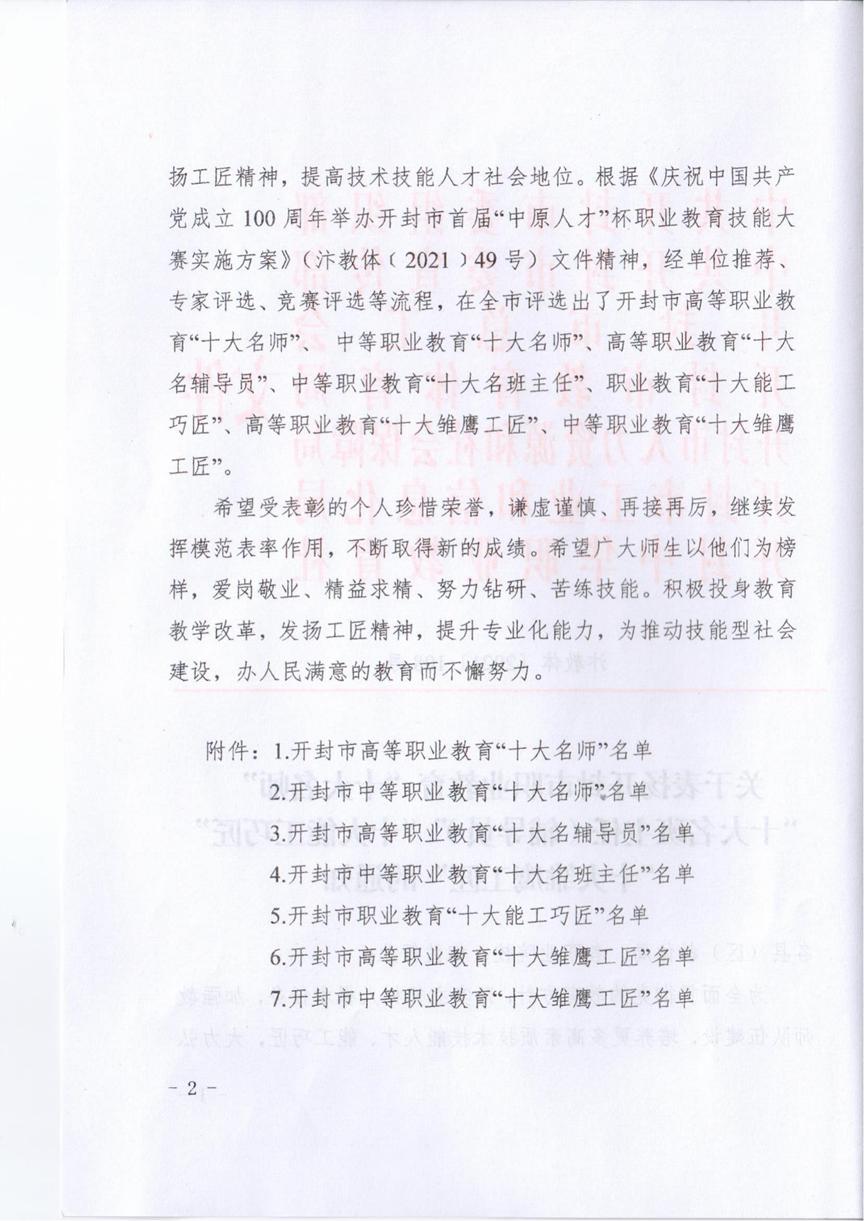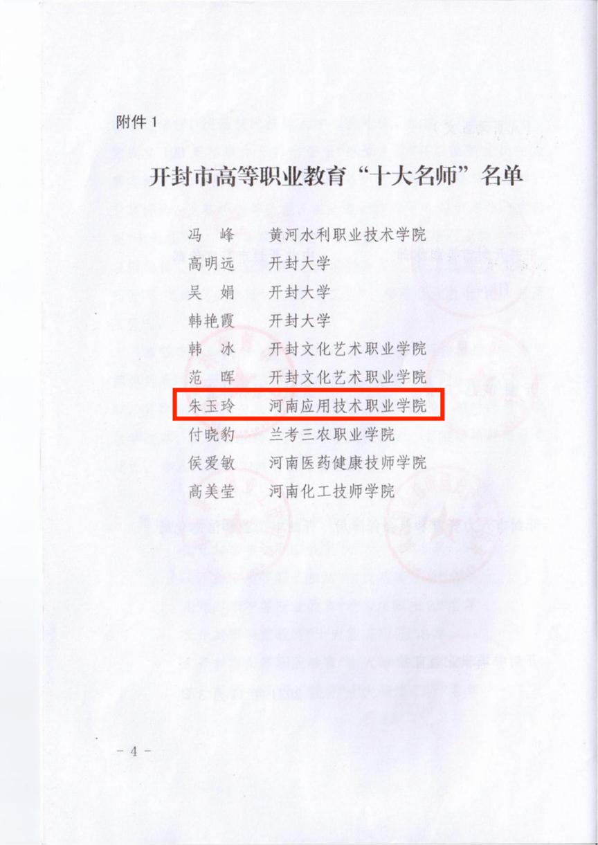 2021年12月16日,由中共开封市委组织部主办、开封市教育体育局承办的首届“中原人才”杯职业教育技能大赛颁奖仪式在汴梁小宋城举行,必赢官网制药工程学院朱玉玲老师经过层层选拔和严格考核,被评为开封市高等职业教育“十大名师”荣誉称号。